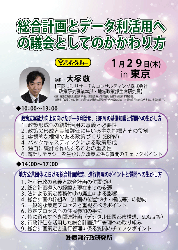 | 講師 | 大塚 敬 (三菱UFJリサーチ&コンサルティング株式会社 政策研究事業本部 地域政策部 主席研究員) |